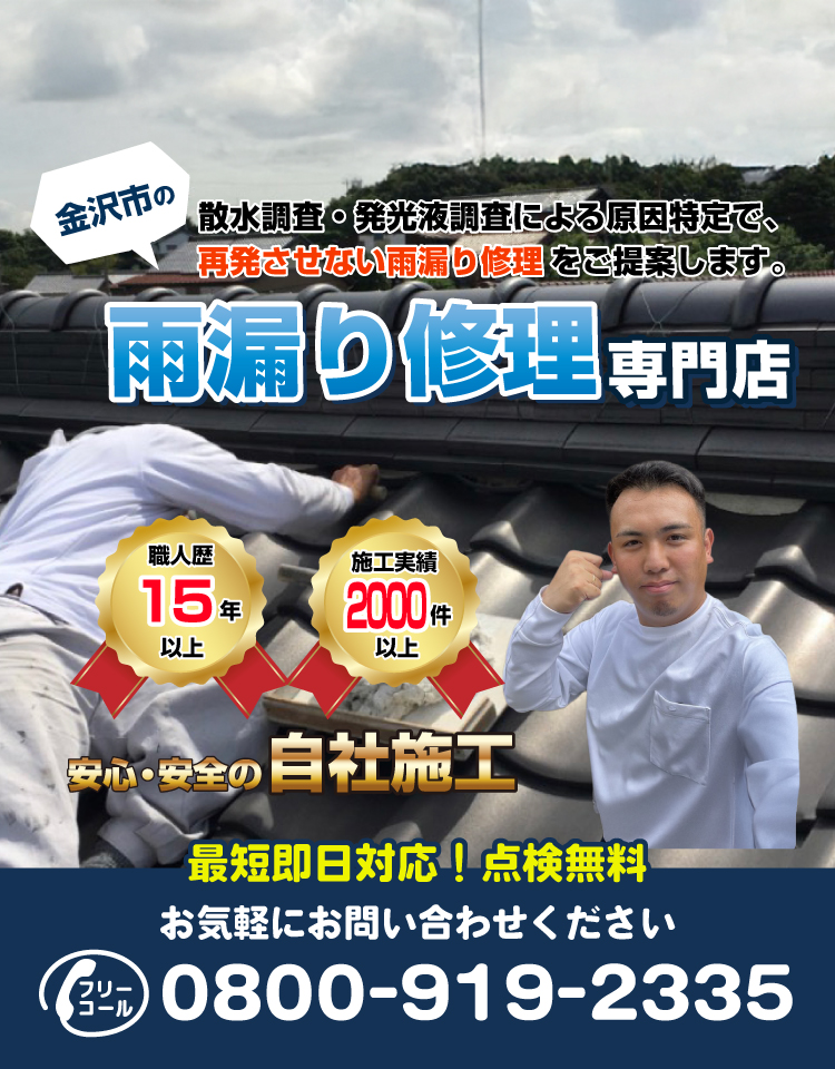 金沢市雨漏り修理工房では、調査から施工までを自社の職人が一貫して対応しています。下請け業者を挟まないため、余計な中間マージンが発生せず、適正で分かりやすい価格をご提供できます。また、急な雨漏りにも柔軟に対応できる体制を整えており、最短即日での対応も可能です。「高いのでは…」と不安な方も、まずは無料点検で現状をご確認ください。